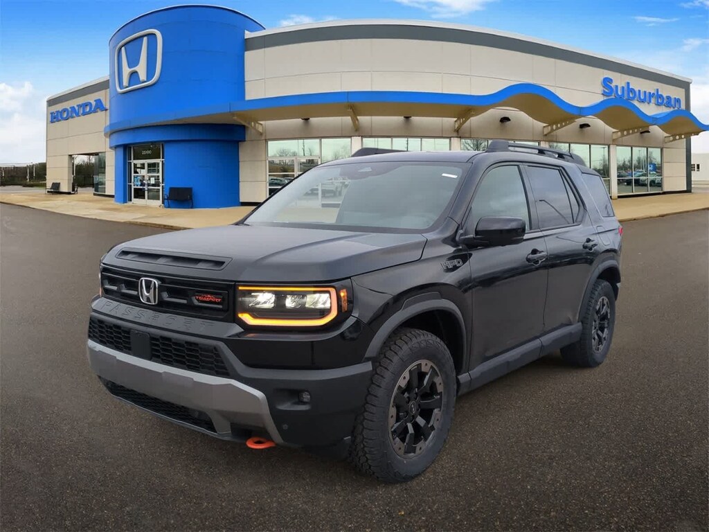 12 Speakers, 4-Wheel Disc Brakes, ABS brakes, Adaptive Cruise Control: Adaptive Cruise Control (ACC) with Low-Speed Follow, Air Conditioning, Alloy wheels, Apple CarPlay/Android Auto, Auto High-beam Headlights, Auto-dimming door mirrors, Auto-dimming Rear-View mirror, Automatic temperature control, Blind Spot Information (BSI) System warning, Brake assist, Compass, Delay-off headlights, Driver door bin, Driver vanity mirror, Drivers Seat Mounted Armrest, Dual front impact airbags, Dual front side impact airbags, Electronic Stability Control, Emergency communication system: HondaLink, Exterior Parking Camera Rear, Four wheel independent suspension, Front anti-roll bar, Front Bucket Seats, Front Center Armrest, Front dual zone A/C, Front fog lights, Front reading lights, Fully automatic headlights, Heated & Ventilated Front Bucket Seats, Heated door mirrors, Heated front seats, Heated rear seats, Heated steering wheel, HVAC memory, Illuminated entry, Knee airbag, Lane departure: Lane Keeping Assist System (LKAS) active, Leather steering wheel, Low tire pressure warning, Memory seat, Navigation system: Google Maps, Occupant sensing airbag, Outside temperature display, Overhead airbag, Overhead console, Panic alarm, Passenger door bin, Passenger seat mounted armrest, Passenger vanity mirror, Perforated Leather Seat Trim, Power door mirrors, Power driver seat, Power Liftgate, Power moonroof, Power passenger seat, Power steering, Power windows, Radio data system, Radio: Bose Premium Sound System w/12 Speakers, Rain sensing wipers, Rear air conditioning, Rear anti-roll bar, Rear reading lights, Rear seat center armrest, Rear window defroster, Rear window wiper, Remote keyless entry, Security system, Speed control, Speed-sensing steering, Split folding rear seat, Spoiler, Steering wheel mounted audio controls, Tachometer, Telescoping steering wheel, Tilt steering wheel, Traction control, Trip computer, Turn signal indicator mirrors, Variably intermittent wipers, Ventilated front seats, and Wheels: 18 Berlina Black Machine Face Alloy Bluetooth Backup Camera. Crystal Black Pearl 2026 Honda Passport TrailSport Elite 10-Speed Automatic